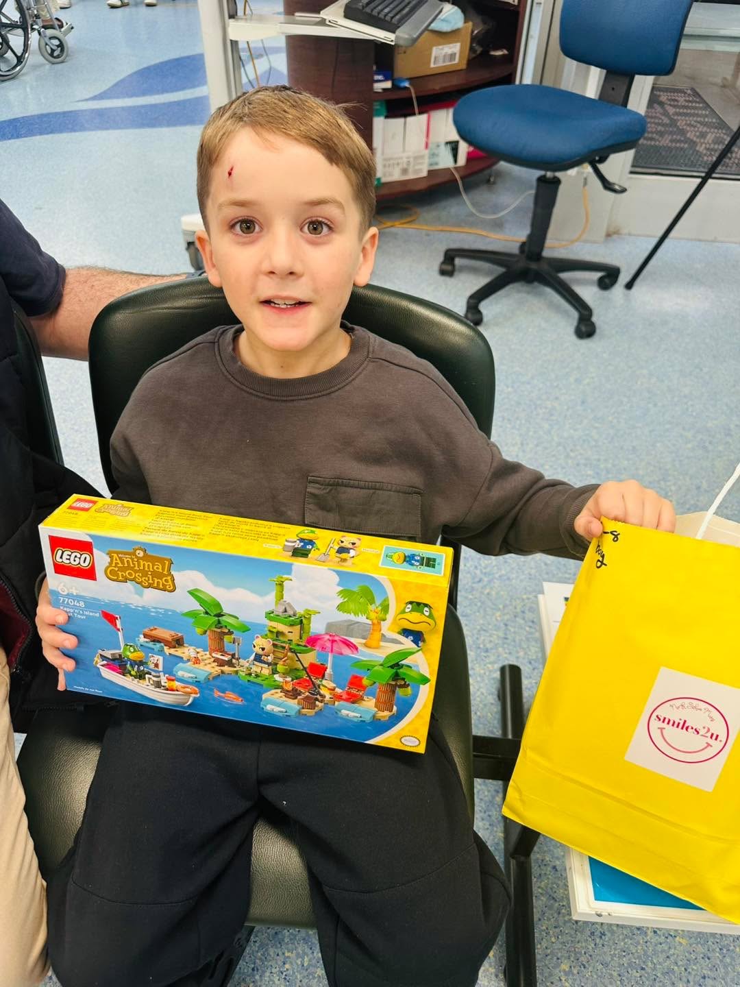 We distribute Lego to our local hospitals under our plan with Smiles2U. The Lego is in our Smiles Bags that are given to children who find themselves in hospital unexpectedly and or need a distraction from what’s going on around them. This particular child found himself in Emergency and was given a bag to cheer him up.